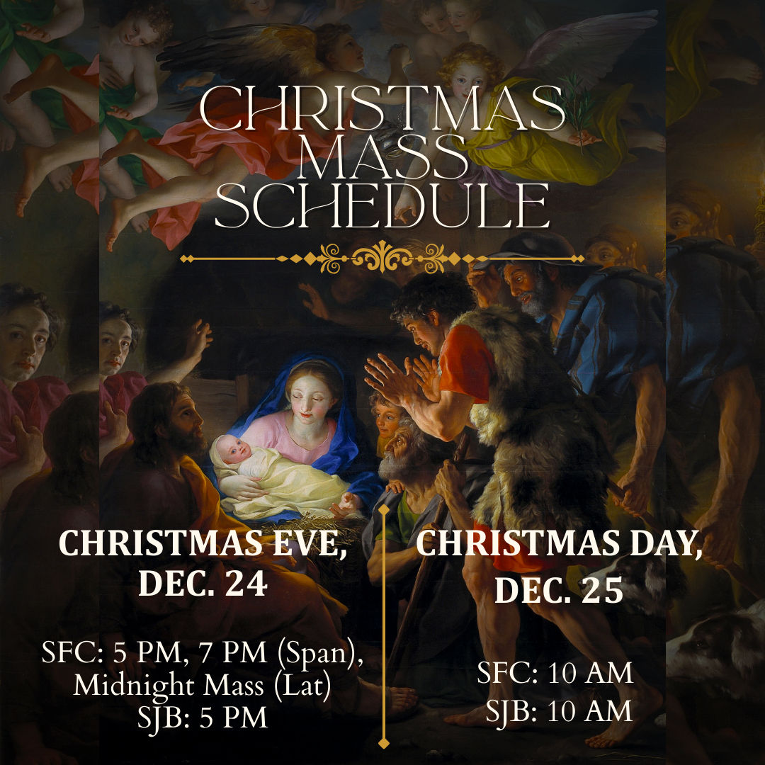 Saturday 5:00pm Vigil Sunday 8:00am, 10:00am, 12:30 pm (Spanish)